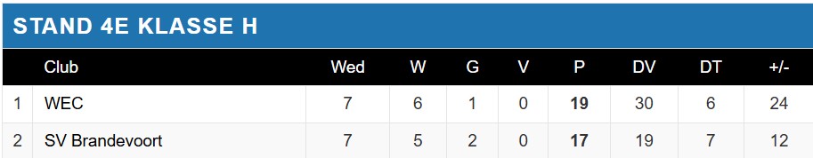 In deze klasse zijn twee kandidaten over voor de eerste periode. WEC en SV Brandevoort. Beide ploegen zijn na zeven wedstrijden nog altijd ongeslagen. WEC heeft met twee punten voorsprong en een veel beter doelsaldo de beste papieren en heeft wellicht voldoende aan een gelijkspel tegen RKGSV.