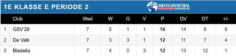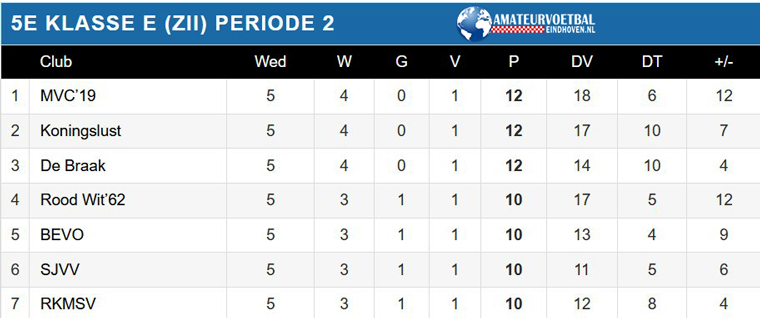 In deze klasse is de strijd nog volop open. LSV voert de ranglijst aan, Boskant en Nieuw Woensel volgen op 1 punt. De Bocht’80 zit op vinkentouw met drie punten minder dan LSV.