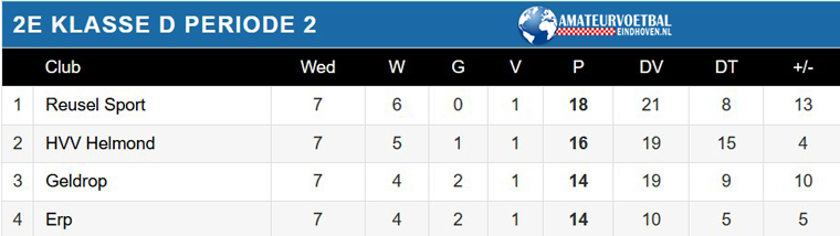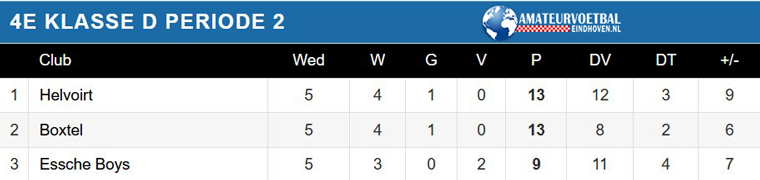 In de 4e klasse D staan Helvoirt en Boxtel met 13 punten bovenaan in de tweede periode. Gezien Boxtel de eerste periode al binnen heeft kan het bijna niet meer mis voor Helvoirt gezien de voorsprong van vier punten op de concurrentie.