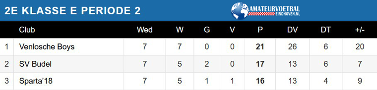 SV Budel lijkt na een goede reeks naast de tweede periodetitel te grijpen. Venlosche Boys staat met nog twee wedstrijden te gaan vier punten los. Bij winst op Sporting Heerlen aanstaande zondag is deelname aan de nacompetitie een feit.