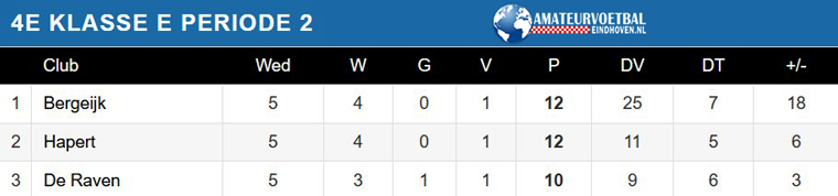 De promovendi in de 4e klasse E doen het goed in de competitie. DOSKO’32 heeft de eerste periode al binnen, terwijl Hapert en De Raven naast Bergeijk nog volop in de strijd zijn voor een nacompetitieplaats.