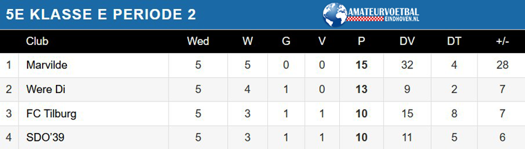 Marvilde is een maatje te groot in de 5e klasse E. Het staat ongeslagen bovenaan en heeft de eerste periodetitel al binnen. Er zijn drie ploegen die op afstand volgen, maar volop in de strijd zijn voor de tweede plek op de eindranglijst, want deze positie betekent directe promotie. Were Di, FC Tilburg en SDO’39 gaan de komende weken uitvechten wie de tweede periode verovert en wie aanspraak maakt op de tweede plaats op de eindranglijst. Were Di heeft -tot nu toe- de beste papieren.
