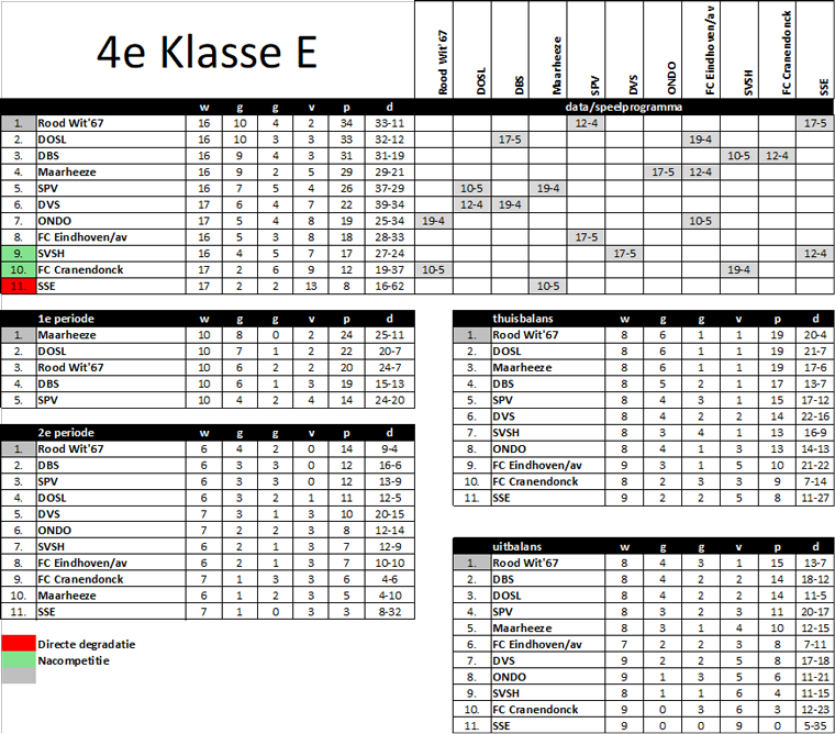 In de 4e Klasse E is Rood Wit’67 de absolute favoriet. Qua punten zijn de verschillen klein met de nummers twee en drie DOSL en DBS en mag je deze ploegen dan ook eigenlijk nog niet uitsluiten. Gelet op het resterende programma, zonder ploegen tekort te doen, zou er echter geen vuiltje aan de lucht mogen zijn.