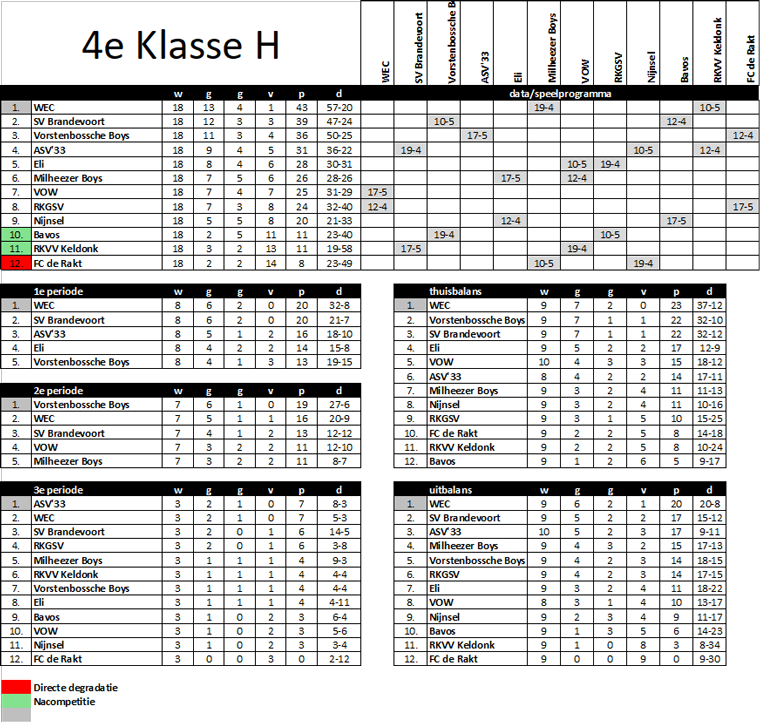 In de 4e Klasse H degradeert één ploeg rechtstreeks en zullen twee ploegen de nacompetitie in moeten om zich te handhaven. Het verschil tussen de nu veilig negende plek van Nijnsel en de nummer tien en elf Bavos en RKVV Keldonk bedraagt negen punten. Dat betekent dat Nijnsel eigenlijk zo goed als veilig is. Zowel Bavos als RKVV Keldonk moeten minimaal drie van de vier wedstrijden winnen wil het Nijnsel, dat dan alles moet verliezen, achterhalen. Dit lijkt een utopie daar Bavos tot nu toe nog maar twee keer in totaal wist te winnen en RKVV Keldonk driemaal. Bavos gaat komende zondag op bezoek bij Brandevoort terwijl het de week daarna Vorstenbossche Boys ontmoet.