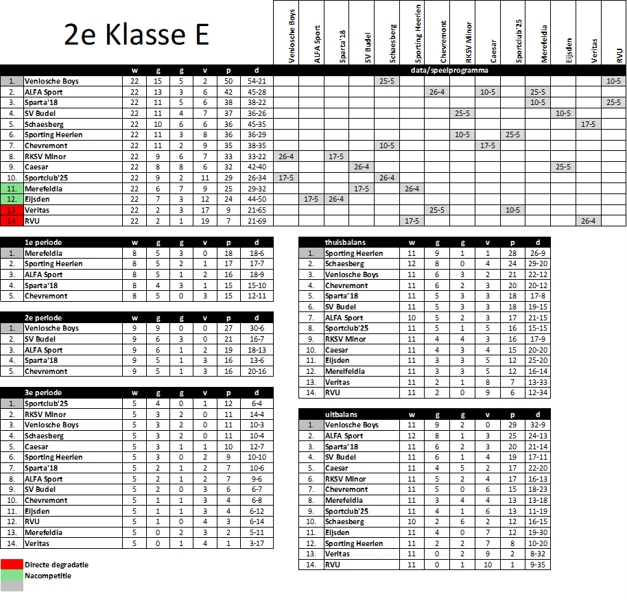 In de 2e Klasse E degraderen twee ploegen en moeten er twee ploegen de nacompetitie. De twee degradanten zijn al bekend namelijk RVU en Veritas. Veritas behaalde tot dusverre negen punten, RVU zeven. Beide wisten op eigen veld tweemaal te winnen en wisten op vreemde bodem geen enkele keer de drie punten te pakken.