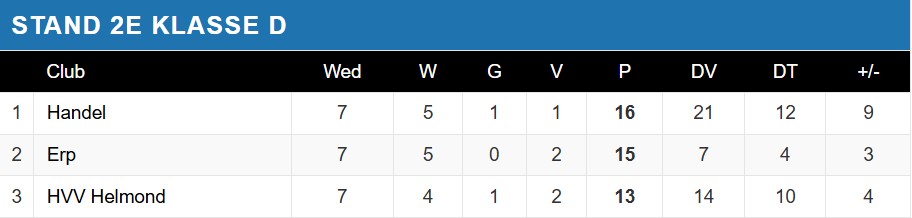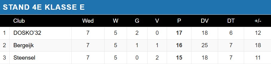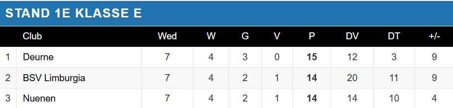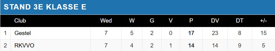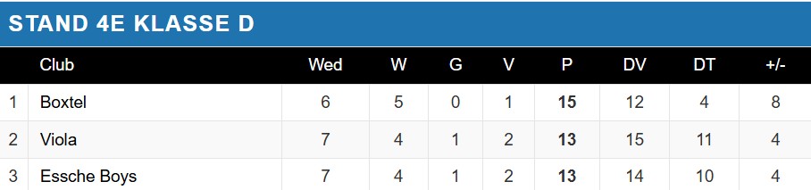 Boxtel voert de ranglijst aan, maar moet op 20 november nog een restant van 17 minuten uitspelen tegen Spoordonkse Boys (stand 1-2).