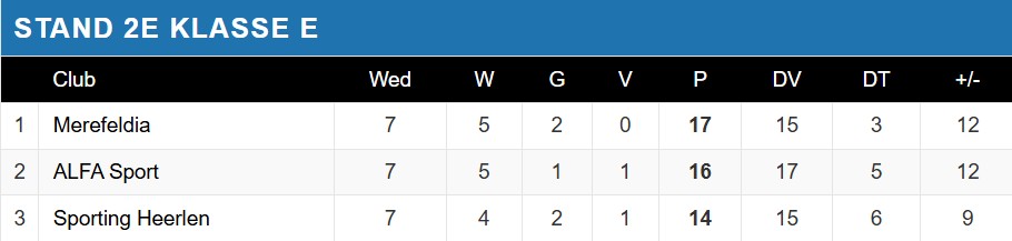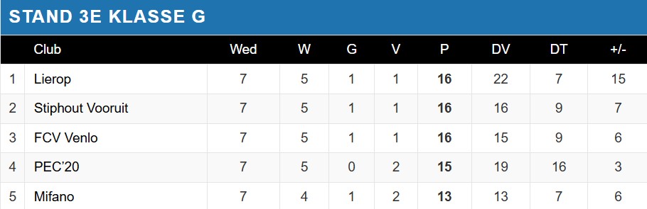 SV Lierop, Stiphout Vooruit en FCV Venlo hebben allen 16 punten. SV Lierop maakte de grootste kans om de eerste periode te veroveren. De ploeg heeft een veel beter doelsaldo en gaat zondag op bezoek bij laagvlieger Bruheze.