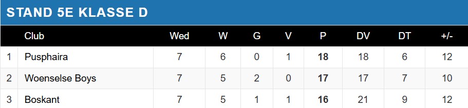 Pusphaira heeft buurman Woenselse Boys inmiddels voorbijgestreefd en gaat met één punt voorsprong de laatste wedstrijd van de eerste periode in.