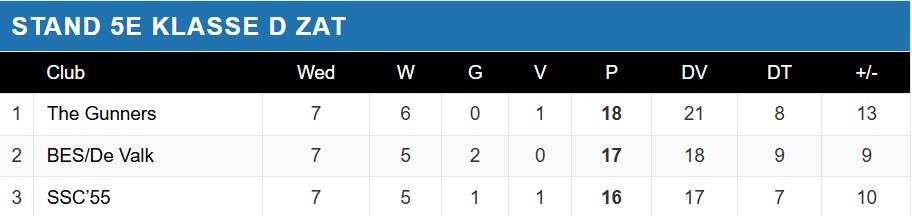BES/De Valk ontvangt koploper The Gunners. Het verschil is één punt in het voordeel van The Gunners. Bij winst pakt BES/De Valk de eerste periodetitel.
