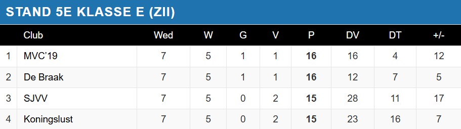 MVC’19 heeft een beter doelsaldo, maar De Braak speelt zondag tegen Sterksel, dat nog nul punten heeft en al 38 tegendoelpunten incasseerde. Dus een grote score ligt voor de hand. MVC’19 gaat op bezoek bij BEVO (nummer 6).