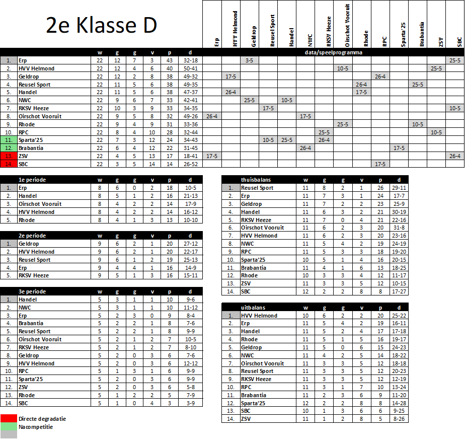 Stel de situatie blijft zoals die nu is; Handel wint de periode en Erp wordt kampioen. De periode van Erp zal dan over gaan naar de hoogste op de ranglijst zonder periode. In dit geval is dat dan HVV Helmond dat dus nog twee loodzware uitwedstrijden heeft bij Handel en Geldrop. Het kan en gaat dan ook nog spannend worden in die 2e Klasse D. Mocht Handel komende zondag bv winnen van HVV Helmond, Geldrop verslaat op eigen veld RPC en Reusel Sport verslaat Rhode dan hebben wij drie nummers twee en staat HVV Helmond ineens vijfde. Mocht Erp dan ook nog eens verliezen bij Oirschot Vooruit dan krijgen we een ongekende spannende slotfase van de competitie. Een ware thriller zowel om het kampioenschap als de periode, als de mogelijke plek voor de nacompetitie.