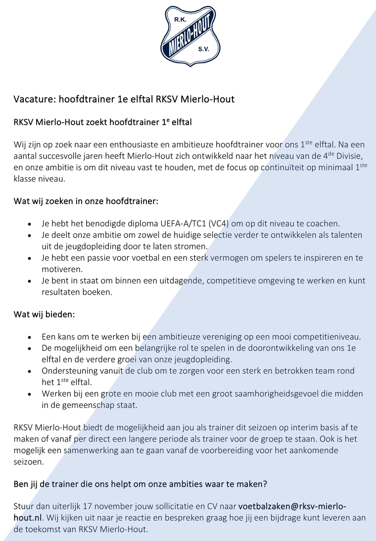 De club is inmiddels op zoek naar een opvolger voor de openstaande functie van hoofdtrainer. (Zie onder het bericht de vacature)