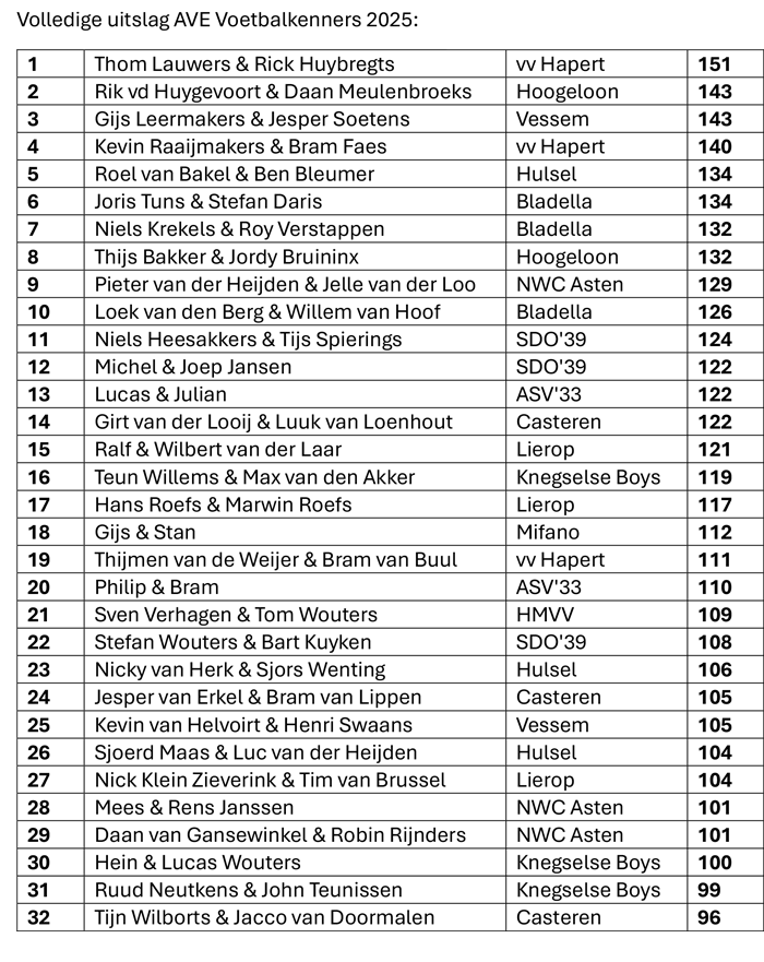 Van de 32 aanwezige duo’s wisten de twee heren van vv Hapert oppermachtig de winst binnen te slepen. Mede door de aanwezigheid van twee andere goedscorende Hapertse duo’s ging de club ook aan de haal met de prijs ‘De Slimste Club’ 2025.